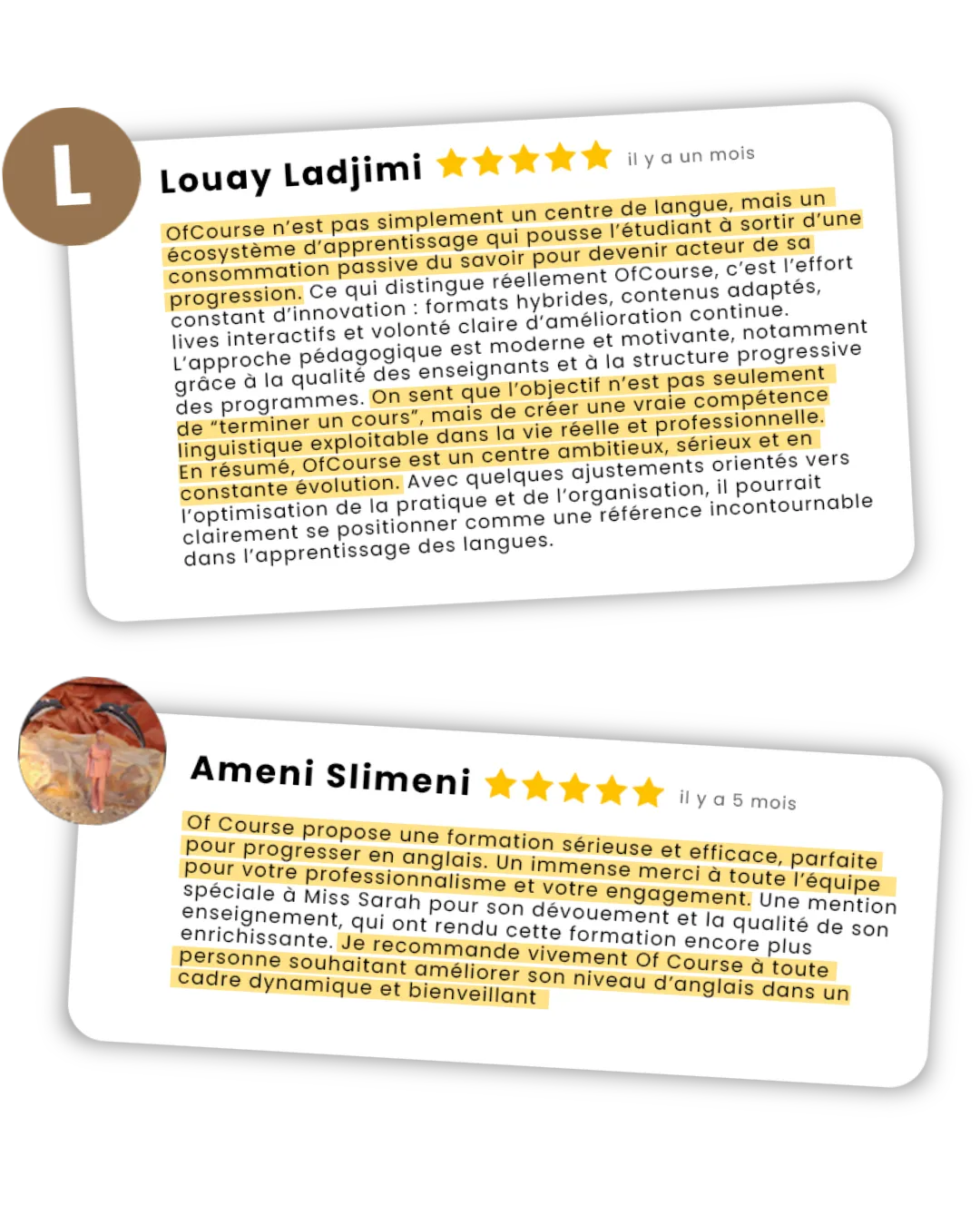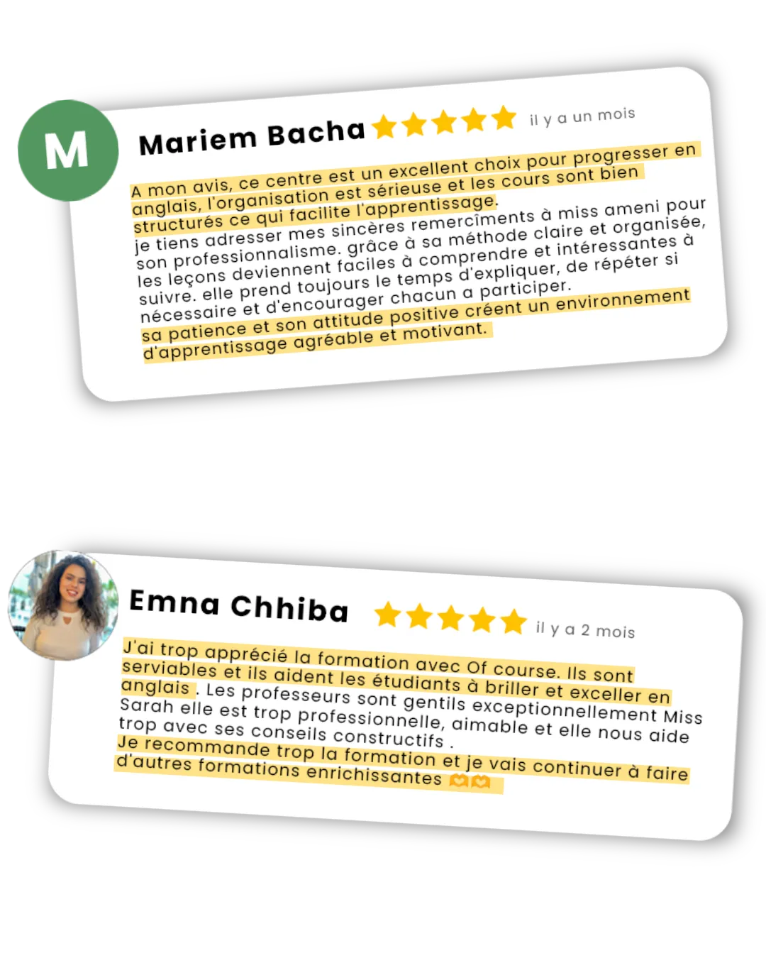 227+ avis Google à 4.9 ⭐ — la meilleure note de toutes les écoles d'anglais en Tunisie.